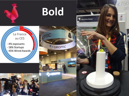 De manière générale, la FrenchTech est audacieuse, cela se reflète par l'innovation de ses startups et leur rôle de Category Maker que les autres pays n'ont pas aujourd'hui. Pour preuve, la France représentait 4% des exposants, 18% des startups au CES 2015 et 45% des awards décernés par Wired (Withings Activité Pop, Casque Zik de Parrot, patins à roulette Rollkers, casque relaxant MeloMind de MyBrain, la pédale connecté de ConnectedCycle sur 11).