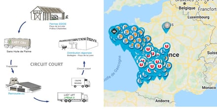 En direct des éleveurs vendent aussi du lait en circuit court en revanche, ils distribuent dans les supermarchés Super U et Leclerc (Ouest de la France).