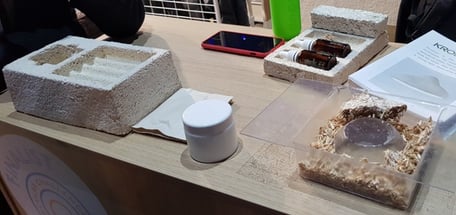 Marine Innovation utilise aussi des algues et d'autres sous-produits (mélasse d'huile de palme...) pour fabriquer des emballages, boîte à oeufs, cales dans les packagings.