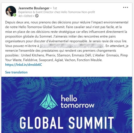 L'événement Hello Tomorrow sur la DeepTech (12 et 13 mars) a aussi une démarche écoresponsable et propose à tous les organisateurs de discuter d'événementiel responsable dans cet esprit.