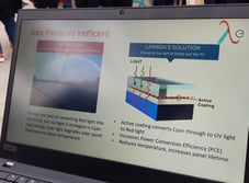 Lambda Energy travaille sur un filtre réalisé en nanoparticules qui transforme les longueurs d'onde bleu et vert en rouge, ce qui augmenterait de 5 points le rendement photovoltaïque (rapport entre la production produite et la puissance du rayonnement (aujourd'hui limitée à 25 %) captée par les panneaux solaires.