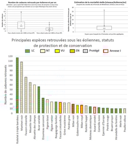Sur les 97 espèces retrouvées, 75 % sont officiellement protégées en France. L'implantation des éoliennes dans ou à proximité des ZPS (Natura 2000) génère la plus grande mortalité.