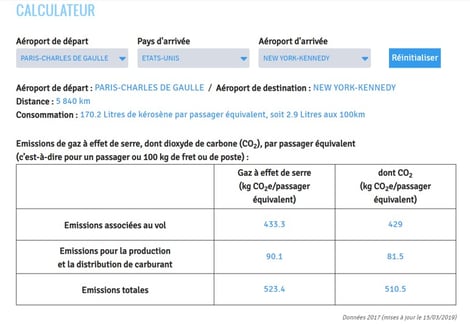 Pour un vol Paris-New York, il y a de nombreuses différences de calcul sur les émissions de CO2 : on peut tenir compte que des émissions liées uniquement au trajet ou intégrer aussi l'amont (ex : l'extraction du carburant, au raffinage et à son trajet du puits au réservoir de l'avion) et les autres effets liés à l'altitude comme les NOx (oxyde d'azote) et les traînées de condensation ( "lignes blanches").
