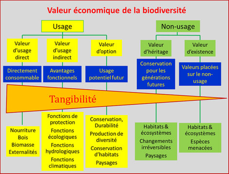On estime que les services mesurables de la biodiversité s'élèveraient à 50 % du PIB mondial soit environ 23 500 milliards d'euros par an. Les exemples les plus connus sont la pollinisation des abeilles, l'absorption de CO2 par la végétation, la protection contre l'érosion des sols,le filtrage de l'eau...