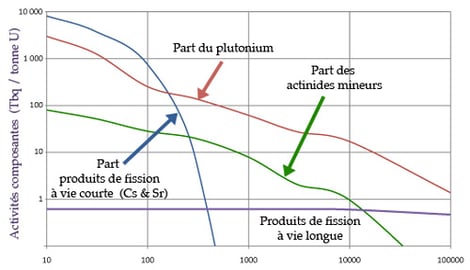 Leur retraitement à la Hague nécessite leur vitrification pour un entreposage en surface et ou leur stockage en couche géologique profonde. Les déchets radioactifs (comme Technétium 99 - article) ont des demi-vies de 200 à 300 000 ans, d'autres comme le Césium 235 a une demi-vie de quelques millions d'années. Leur radiotoxicité diminue avec le temps.