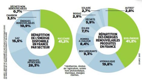 Les trois premières génèrent principalement de l'électricité et les deux dernières du chauffage (en particulier le bois pour la biomasse).