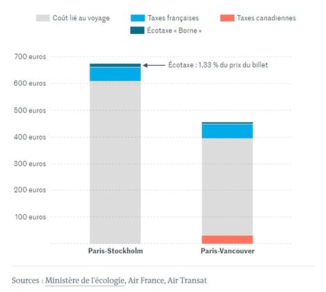 Concrètement, cela représente une taxe de 13 euros sur les vols intérieurs et européens (14 € en GB), 33 euros pour les moyen-courriers et environ 60 euros (86€ en GB) pour les longs courriers. Élisabeth Borne a annoncé une écotaxe sur les billets d'avion mais beaucoup plus faible car plafonnée à 18 euros par billet. Une autre voie serait de taxer le kérosène qui en est exempté en raison de la convention internationale de Chicago sur l'aviation civile internationale que la France a ratifié en 1944 mais c'est très long à négocier !