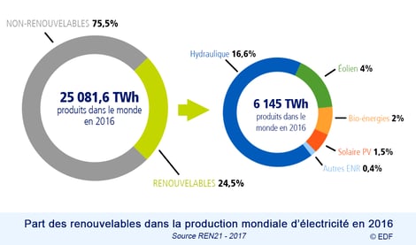 Dans le monde, la production mondiale d'énergie primaire est d'environ 13 790 millions de TEP (2015). La part des énergies renouvelables dans la consommation finale mondiale d'énergie est estimée en 2017 à 18,1 %, dont 7,5 % de biomasse traditionnelle (bois, déchets agricoles, etc.) et 10,6 % d'énergies renouvelables « modernes » : 4,2 % de chaleur produite par les énergies renouvelables thermiques (biomasse, géothermie, solaire), 3,6 % d'hydroélectricité, 2 % pour les autres renouvelables électriques (éolien, solaire, géothermie, biomasse, biogaz) et 1 % pour les biocarburants; leur part dans la production d'électricité était estimée en 2018 à 26,2 %.