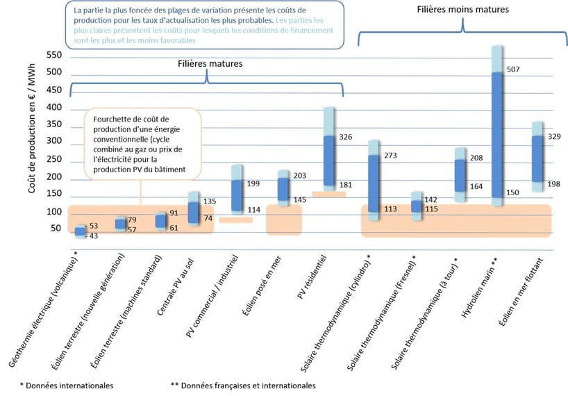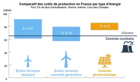 Pour l'éolien, il serait au minimum d'environ de 5,7 cent / kWh et 7,4 cent/kWh pour le solaire professionnel au sol à plus de 17 centimes pour le solaire résidentiel (ADEME).