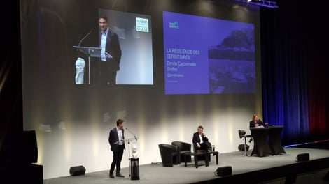 🎤 / 🧗♀️ Intervenir devant cette assemblée était un challenge ;) En effet, beaucoup de maires avaient parfaitement conscience des problématiques de résilience que je présentais, en termes de mobilité, alimentation, logement... et agissaient déjà. Du haut de mon estrade, il m'était facile de dire qu’il serait bien de faire ceci ou cela pour réduire son impact environnemental alors que je n'avais pas les pieds dans la glaise et les mains dans le cambouis.